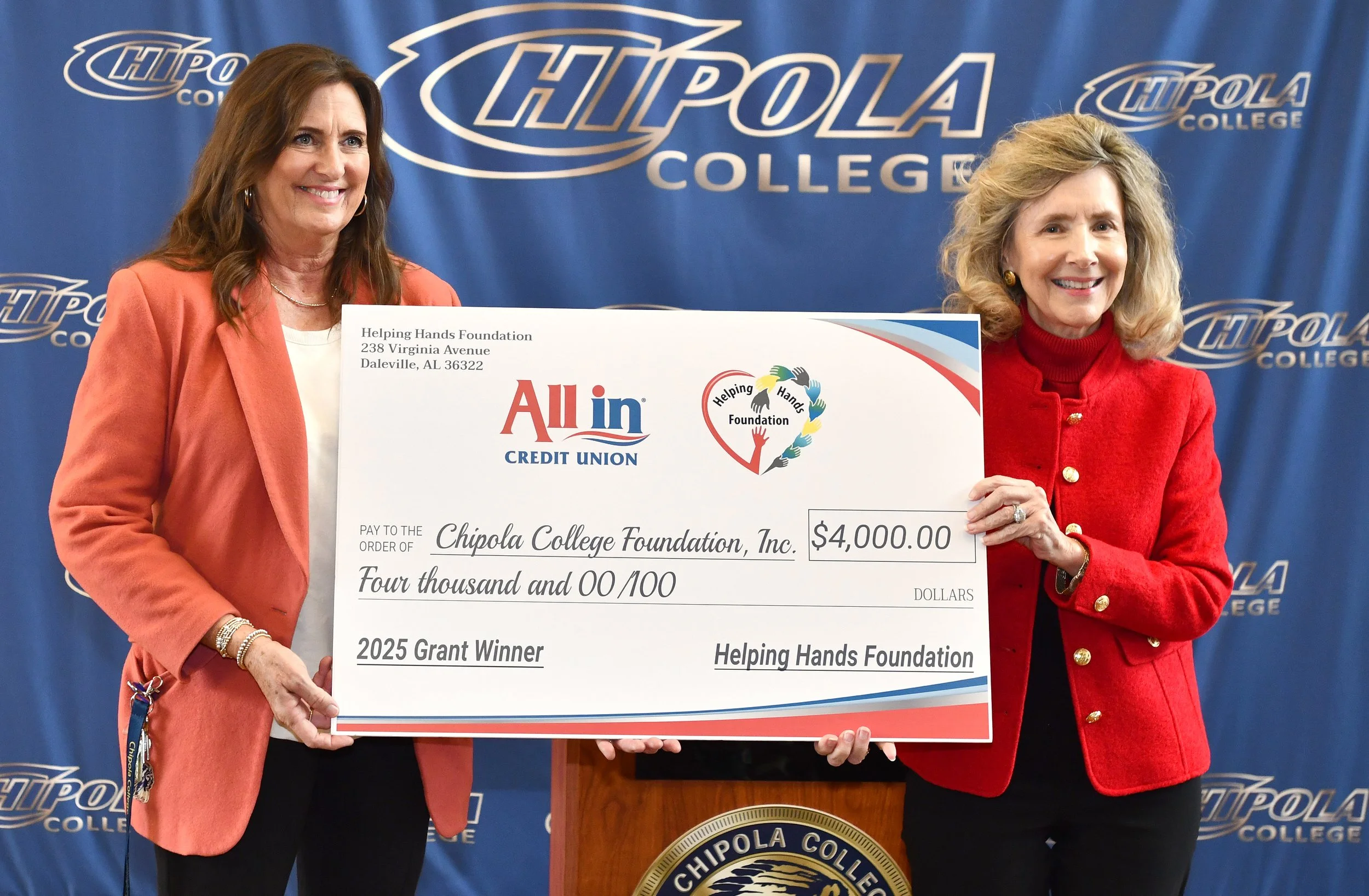 Monetary contributions, along with essential donations for the All-In Food Pantry and the Career Clothes Closet, will help ensure students have what they need to stay confident, supported, and focused. Among those helping strengthen Chipola’s efforts was All In Credit Union, which presented the college with a check through its annual grant program. Their generosity helps keep the Food Bank operating at full capacity so students can concentrate on their studies without worrying about basic needs.
