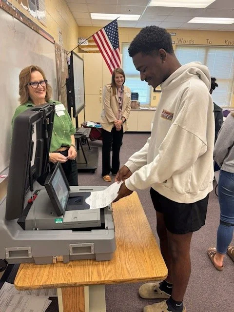 Students heard from Mrs. Dunaway about voter registration, participated in a mock election using real ballots and machines, and learned about the roles of Jackson County’s constitutional officers. A total of 101 students registered or preregistered to vote! One student added “It made me excited to vote and have an impact on the election.”