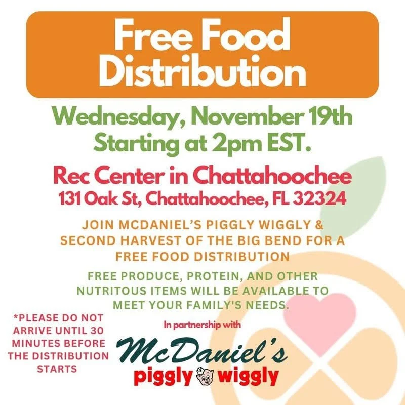 The first distribution will take place at Adam Tucker Wilson Park in Sneads, Florida, beginning at 10 a.m. CST. The second will be held at the Chattahoochee Recreation Center in Chattahoochee, Florida, beginning at 2 p.m. EST.