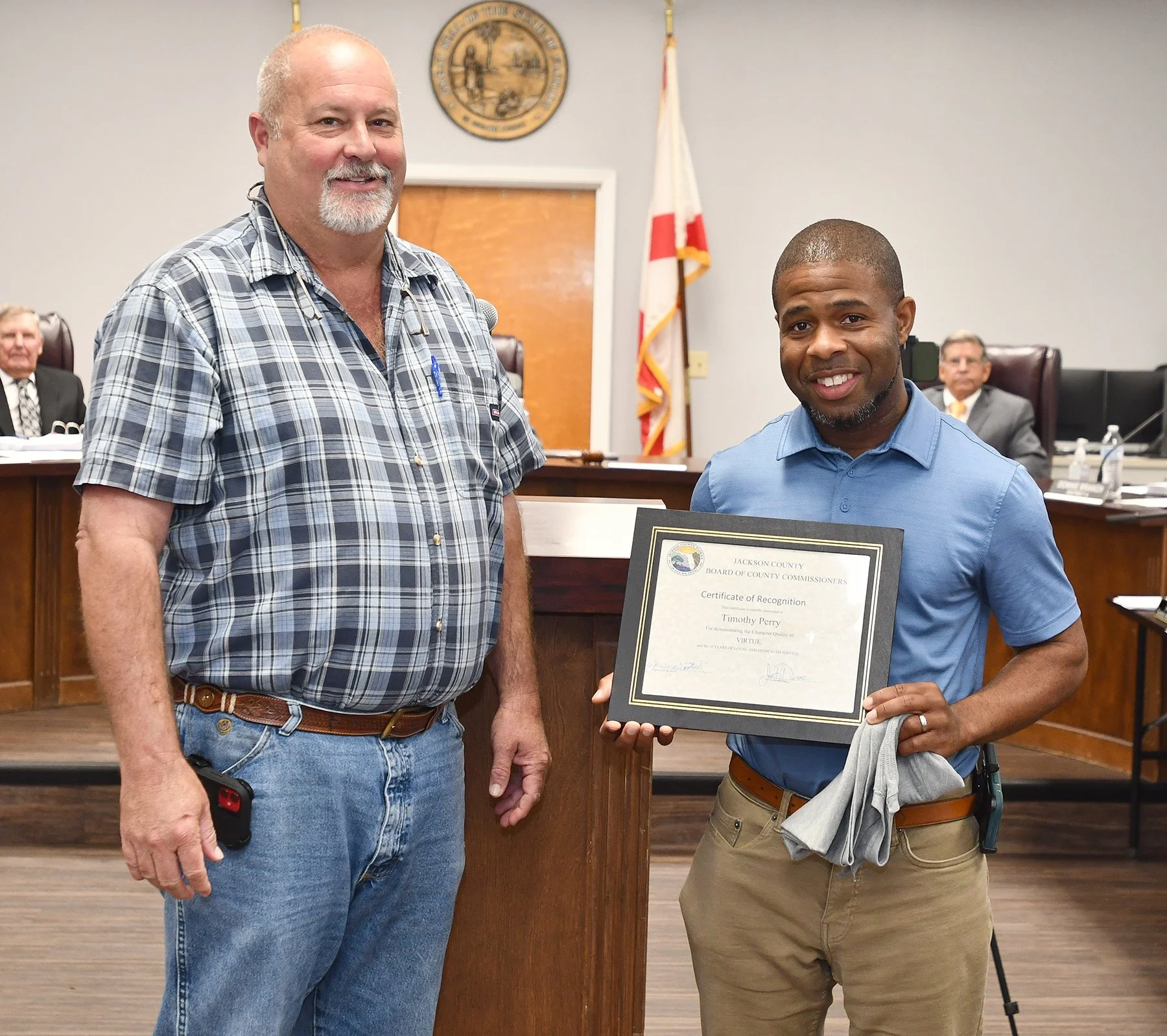 The Jackson County Board of County Commissioners honored Timothy Perry for a decade of dedicated service Tuesday at their regularly scheduled county commission meeting. The presentation was made by Jeffrey Register, Director of Road and Bridge, who praised Perry’s commitment, character, and contributions both on and off the job.
