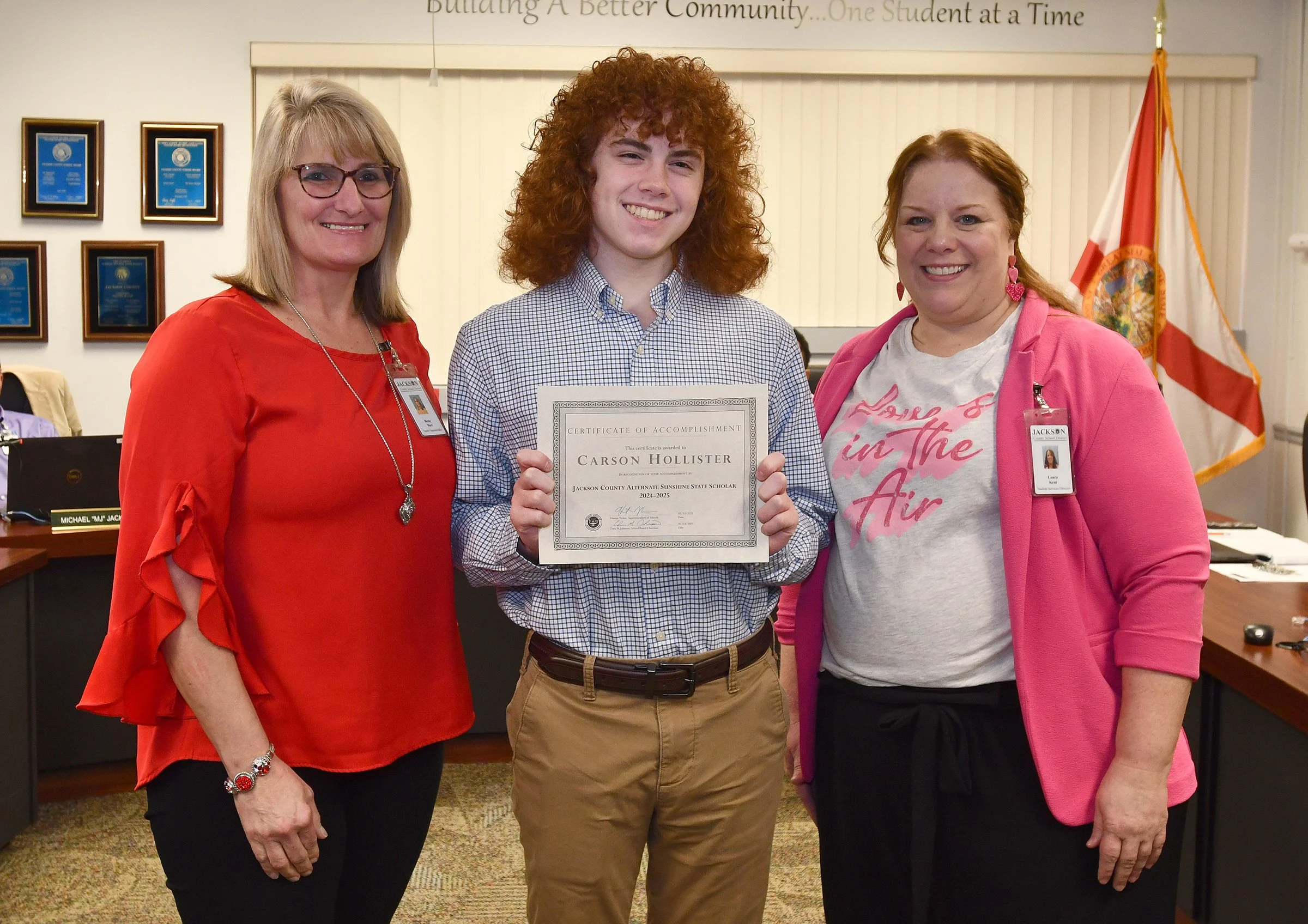 From the left are Jackson County School Deputy Superintendent Becky Hart, Jackson County Alternate Sunshine State Scholar Carson Hollister, and Student Services Director Laura Kent