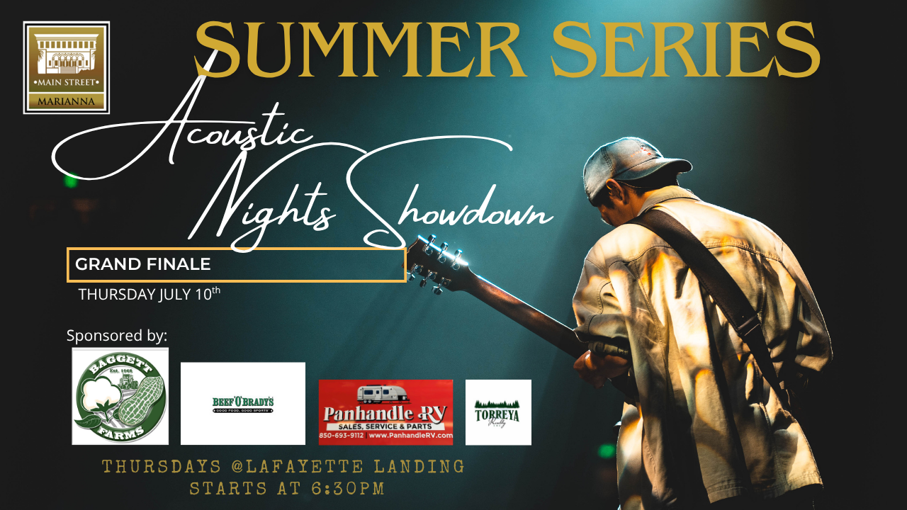 The grand finale of Main Street Marianna’s Acoustic Nights Showdown summer concert series will be at 6:30 p.m. at Lafayette Landing Park in Marianna.